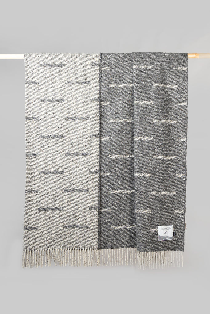 This Maghera throw is named after the beach at the end of the bay in front of the mill. The strong geometric blocks are inspired by the rock strata found by the caves on Maghera beach. It is a reversible throw woven using locally spun flecked yarns gives each throw lots of texture and character making each one unique.